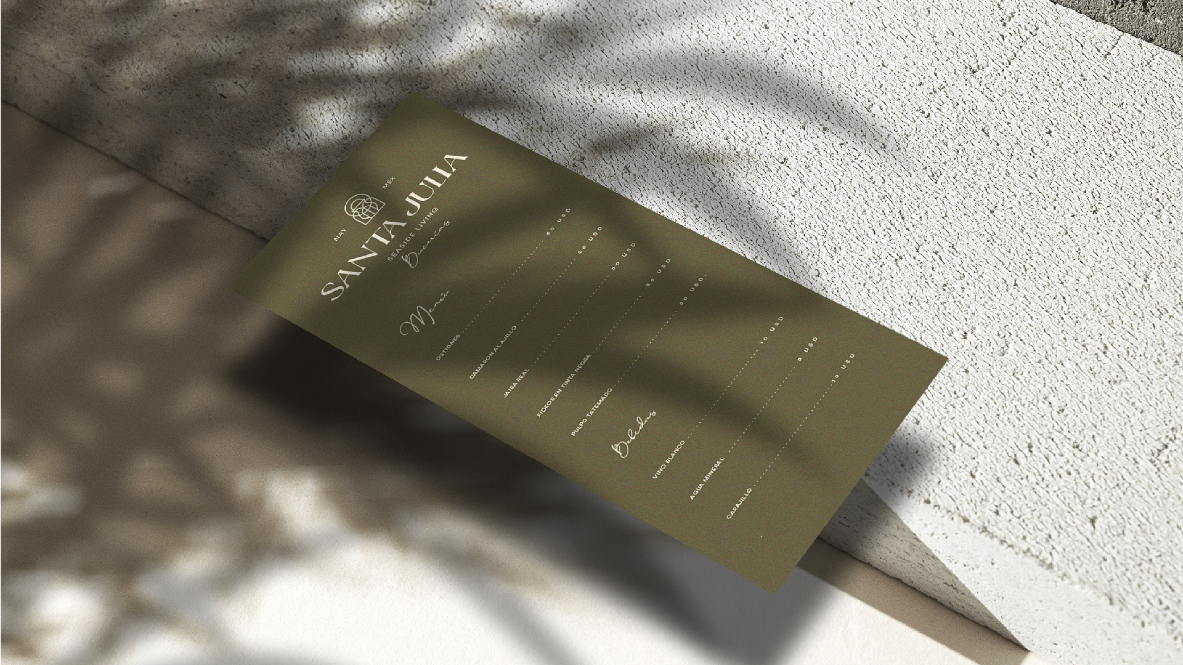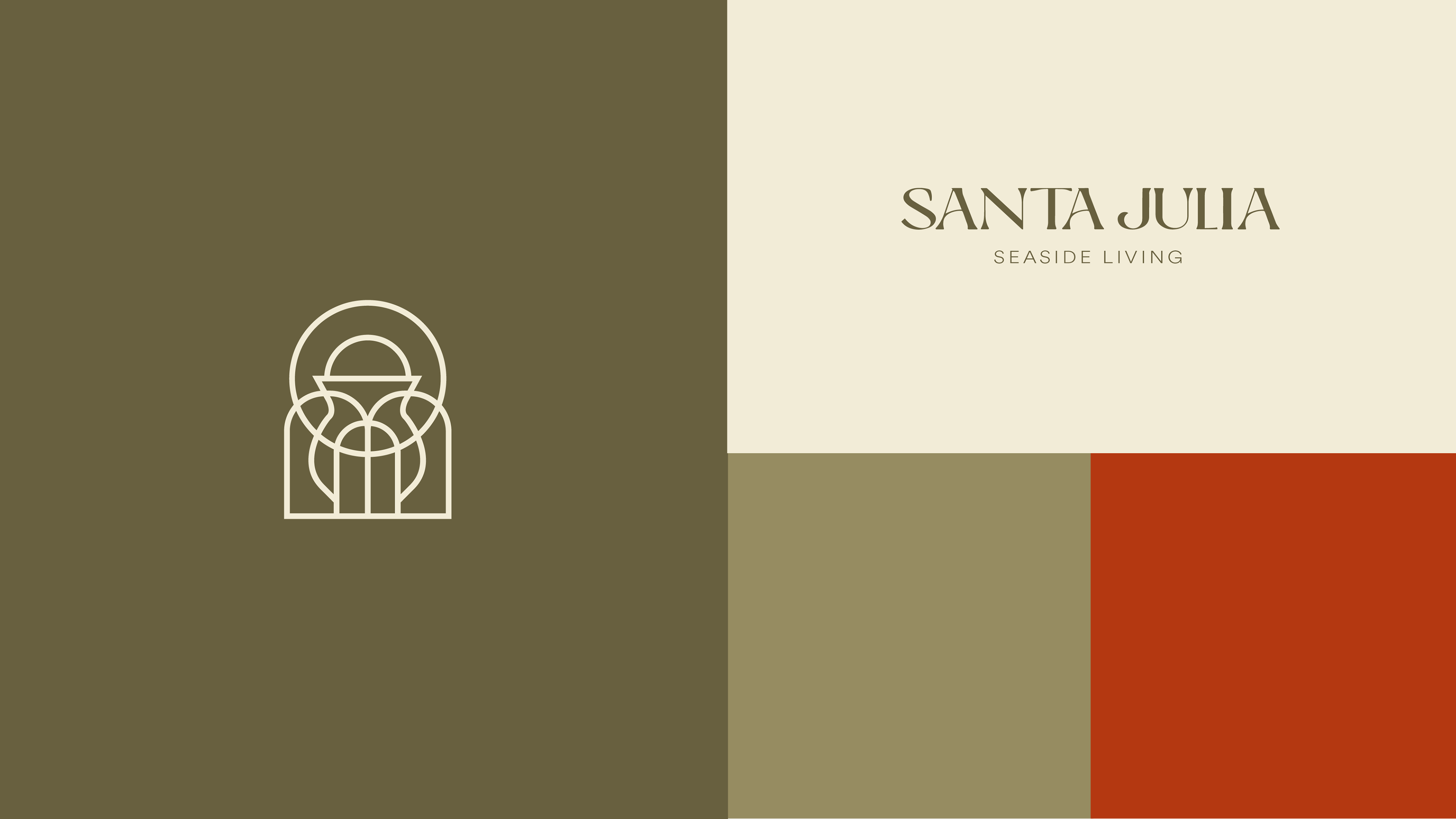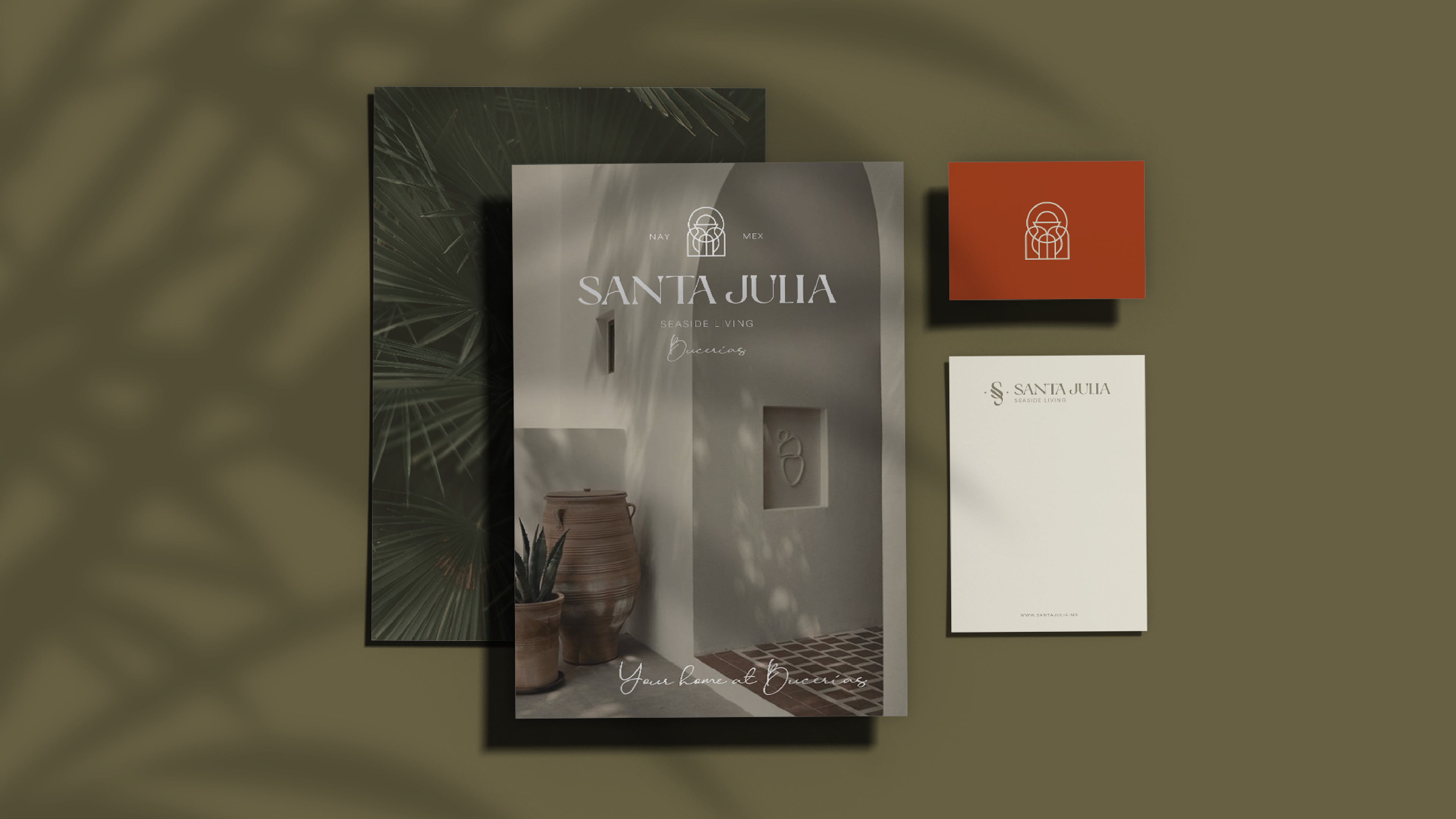 Propuesta de identidad gráfica integral para Santa Julia ® un desarrollo en construcción que incluye el concepto de vivienda y locales comerciales enfocados a la gastronomía, ubicado en Bucerías, Nayarit. Proyecto realizado vía Casa 231 - Año 2023